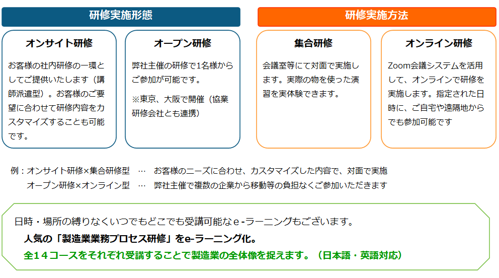 また、様々な学習スタイルに対応するためオンサイト研修(お客様社内研修の講師派遣型)の他、オープン研修やオンライン研修、e-learningを提供しています。